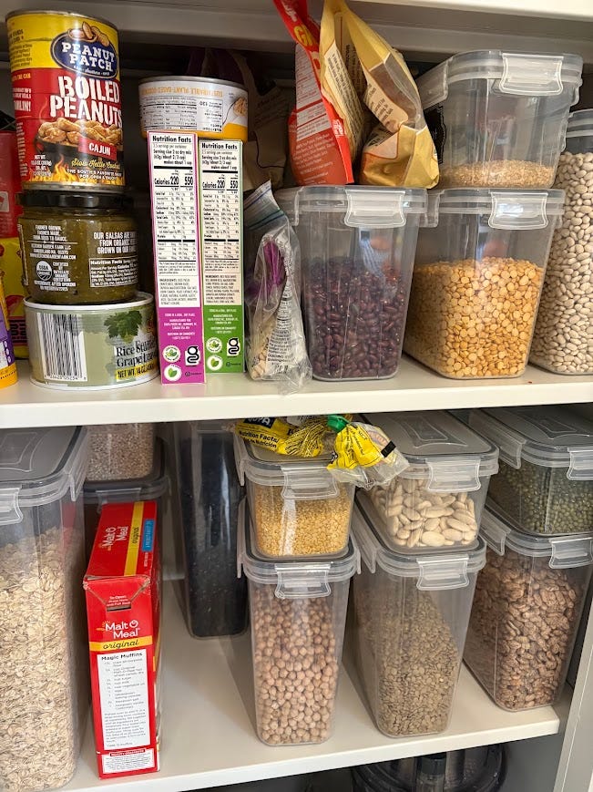 I’m not saying that starting from zero and immediately feeding yourself and a partner on $50 a week (or whatever is a low weekly expense in your local economy) is easy. It’s not, and you aren’t able to eat amazing meals for a while. But it’s not impossible start and build a pantry on a low weekly budget, slowly adding dry bulk items to the cabinet over time. And if you’re in this situation, you don’t actually have to do this at all. Go to the food pantry. They can usually give you the basics for free.